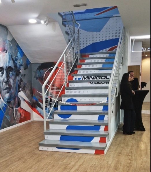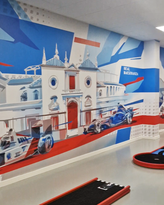 Los murales, diseñados por el artista Alfonso Buendía, son parte esencial del proyecto y construyen una narrativa visual vinculada al contexto y al concepto del centro de ocio. A lo largo del recorrido aparecen escenarios reconocibles de Sevilla, integrando el proyecto en su entorno cultural y urbano. La presencia de coches de Fórmula 1 refuerza la idea de velocidad asociada al karting, mientras que las figuras de golfistas conectan directamente con la dinámica del juego.